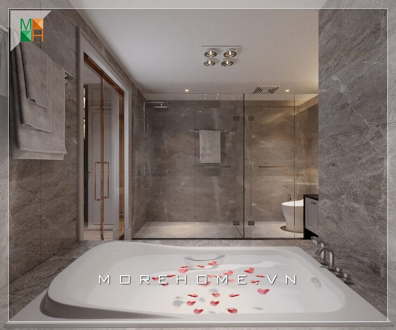 Phòng tắm chính của biệt thự, nhà phố, chung cư cao cấp thiết kế theo kiểu hiện đại, chia ngăn sạch sẽ bằng kính chắn cường lực cao cấp