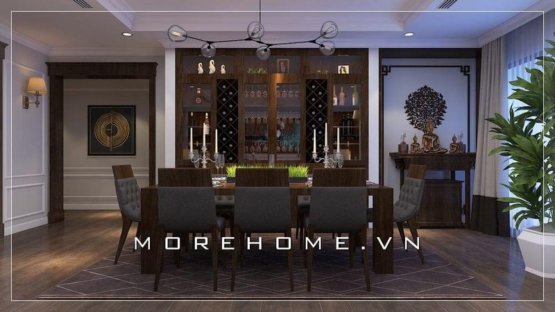 Chiêm ngưỡng mẫu thiết kế nội thất chung cư đẹp gỗ tự nhiên với bộ bàn ăn gỗ óc chó đệm vải độc đáo kêt hợp tủ gỗ trưng bày rượu sang trọng