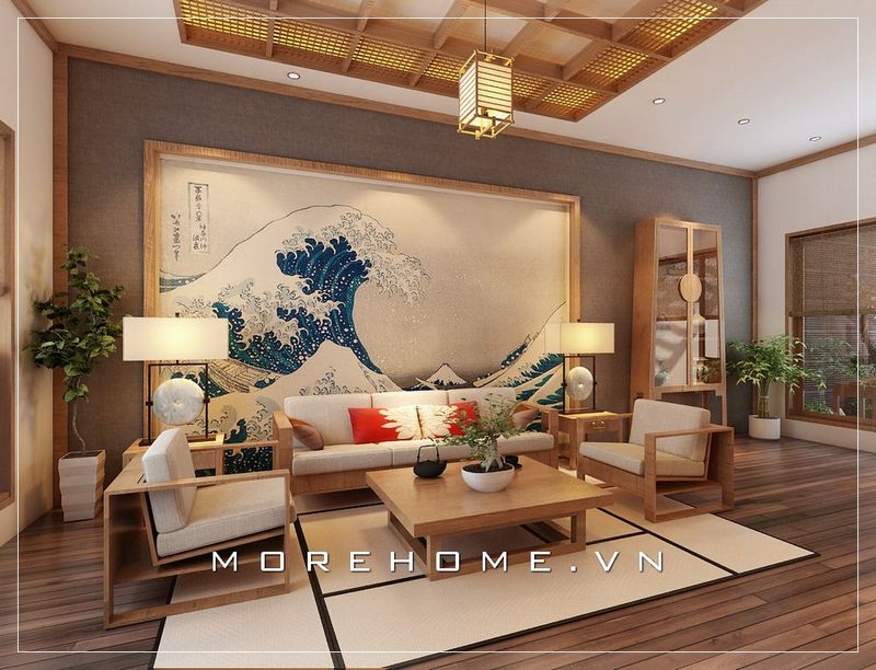 Thiết kế phòng khách chung cư phong cách Nhật Bản ấn tượng với cách lựa chọn bức tranh treo tường treo tường sắc xanh nổi bật giữa một bối cảnh gỗ mộc mạc.