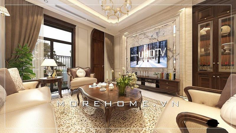 Sự trang trí đồ nội thất theo phong cách tân cổ điển đã tạo nên nét đẹp độc đáo, sang trọng, quý phái cho không gian phòng khách đặc biệt với các loại hình nhà như biệt thự, nhà phố.