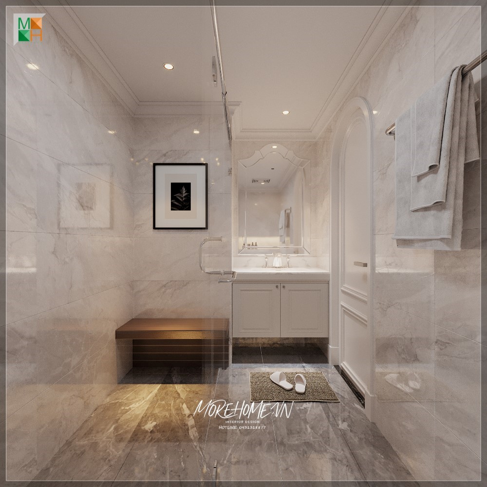 Vách tắm kính 180 độ phân chia giữa 2 khu vực ướt và khô ngăn chắn nước giảm thiểu sự ướt át khó chịu mà không gian thông thoáng hiện đại.
