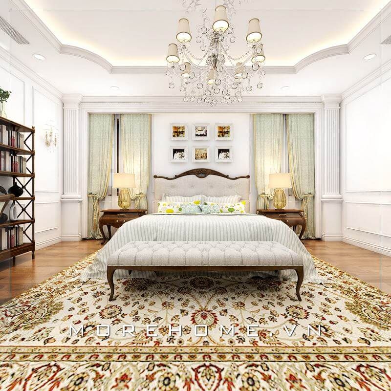 Thiết kế nội thất phòng ngủ biệt thự cao cấp với mẫu giường ngủ bọc nỉ đẹp tân cổ điển