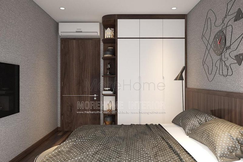 Thiết kế phòng ngủ chung cư nhỏ hiện đại, tủ quần áo kịch trần âm tường đã tận dụng triệt để được góc khuất căn phòng tạo cho căn phòng thêm phần thông thoáng hơn