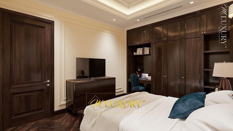 Thiết kế phòng ngủ chung cư phong cách tân cổ điển sang trọng, nội thất gỗ óc chó màu nâu ấn tượng tạo không gian nghỉ ngơi thêm phần ấm cúng