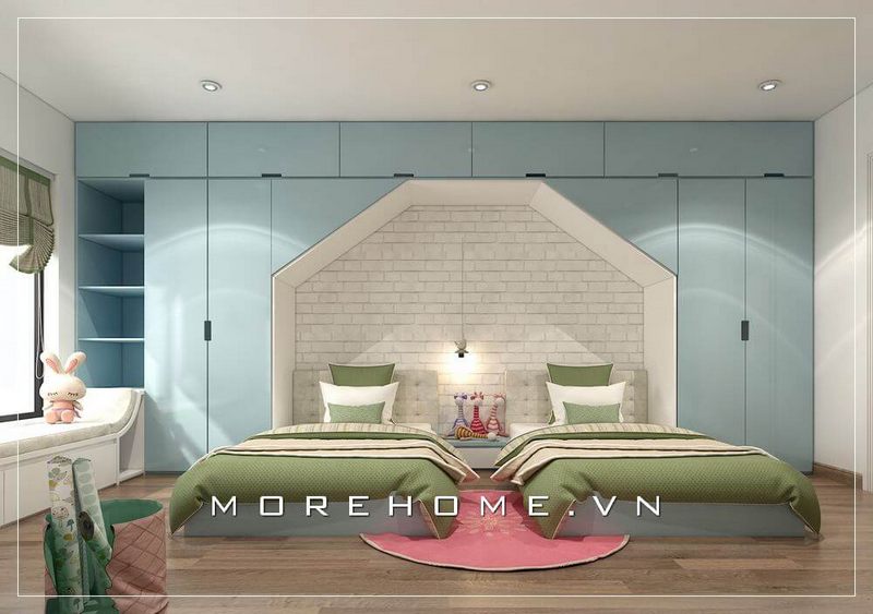 Tủ quần áo gỗ công nghiệp Acrylic màu trắng trẻ trung được thiết kế tận dụng khoảng trống giúp phòng ngủ trẻ em thêm gọn gàng hơn