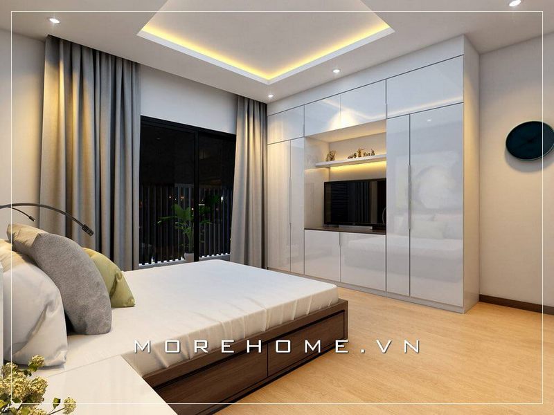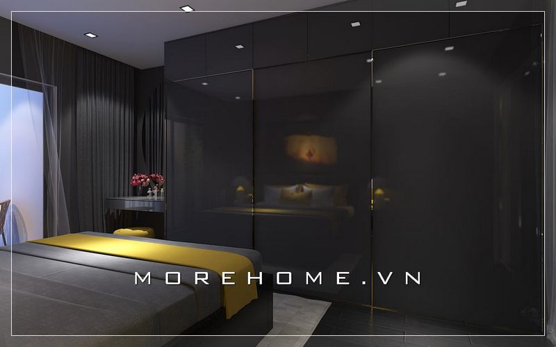 Tủ quần áo gỗ công nghiệp phủ bóng gương, lối thiết kế âm tường giúp tiết kiệm được phần lơn cho không gian nhà nhỏ