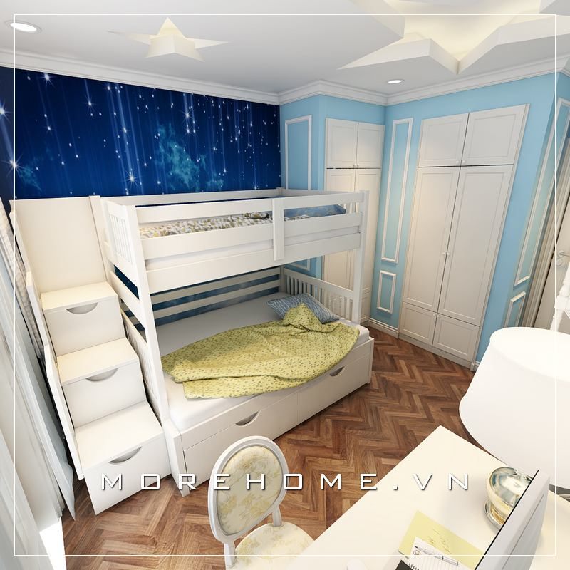 Giường tầng trẻ em được thiết kế theo phong cách hiện đại, trẻ trung, KTS khéo léo kết hợp với ngăn tủ ở từng bậc thang lên xuống giúp con có thêm không gian để lưu trữ đồ dùng của mình