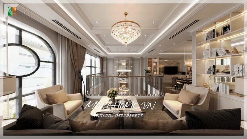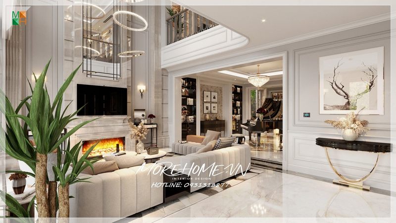 Bố trí nội thất phòng khách thông tầng biệt thự tân cổ điển cao cấp tại Vinhomes Imperia Hải Phòng.
