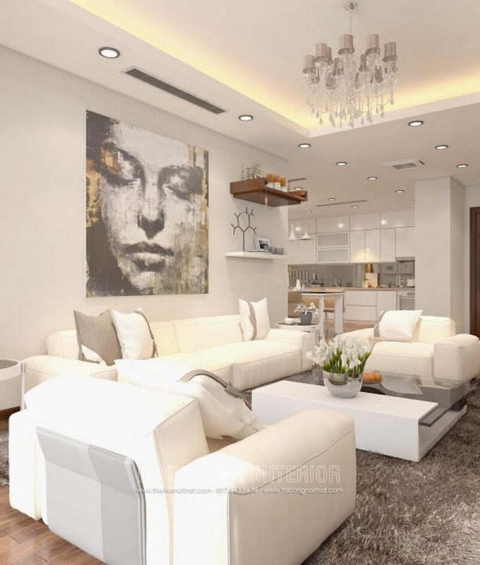 Trang trí nội thất phòng khách chung cư ấn tượng hơn với tone màu trắng sáng được sử dụng tạo điểm nhấn cho các đường nét trạm khắc tinh xảo và khéo léo.