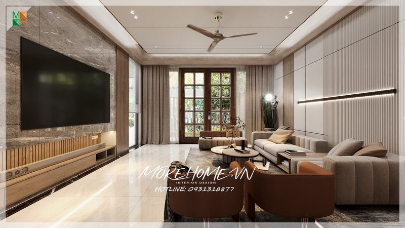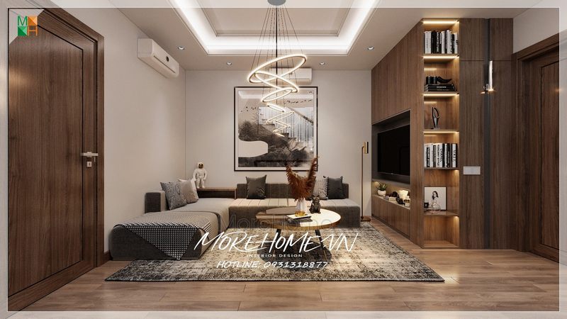Thiết kế phòng khách nhấn mạnh đến sự tối giản, KTS Morehome sử dụng hầu hết các chi tiết trang trí và các vật dụng hiện đại, không đi sâu vào các chi tiết nhỏ giúp không gian trở nên gọn gàng, tinh tế hơn