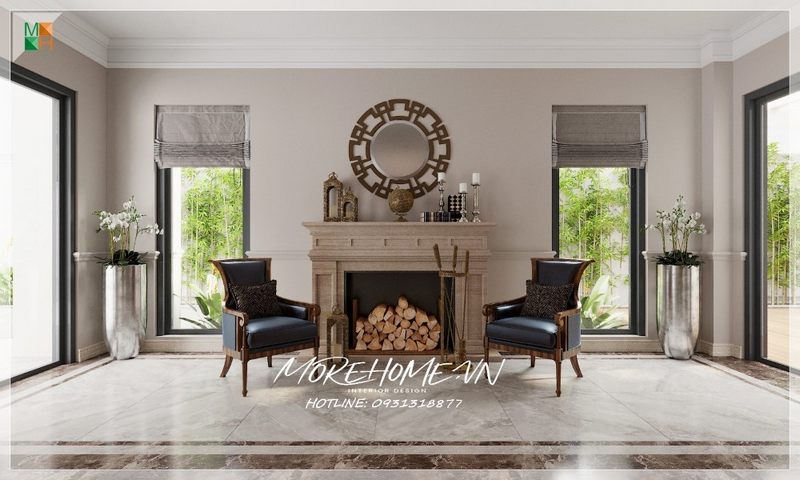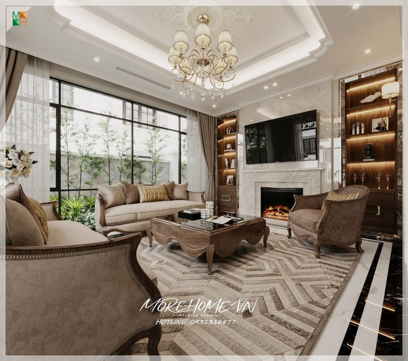 Phòng khách phong cách tân cổ điển cho chung cư, nhà phố, biệt thự do Morehome thực hiện