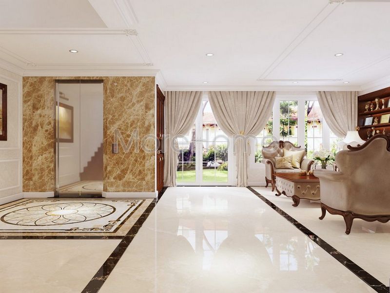 Đá lát sàn với vẻ ngoài sáng bóng không chỉ mang đến sự sang trọng mà còn góp phần tô điểm thêm giá trị thẩm mỹ cho không căn phòng.