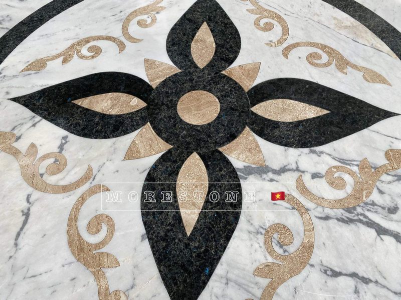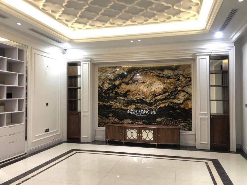 Đẹp nổi bật trên nền của sảnh chờ, phòng khách rộng hay điểm nghỉ của cầu thang là mẫu đá trang trí hoa văn với vẻ tự nhiên của những đường vân cùng nhiều chi tiết đối xứng, hài hòa.
