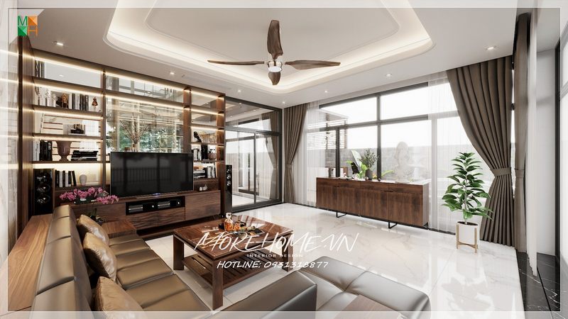 Thiết kế nội thất phòng khách của biệt thự, nhà phố xứng tầm đẳng cấp khi sử dụng nội thất gỗ óc chó từ sofa, kệ tủ mang đến sự thống nhất, gần gũi.