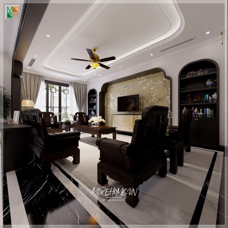 Bản sắc dân tộc được KTS Morehome gửi trọn trong mẫu thiết kế phòng khách biệt thự á đông này