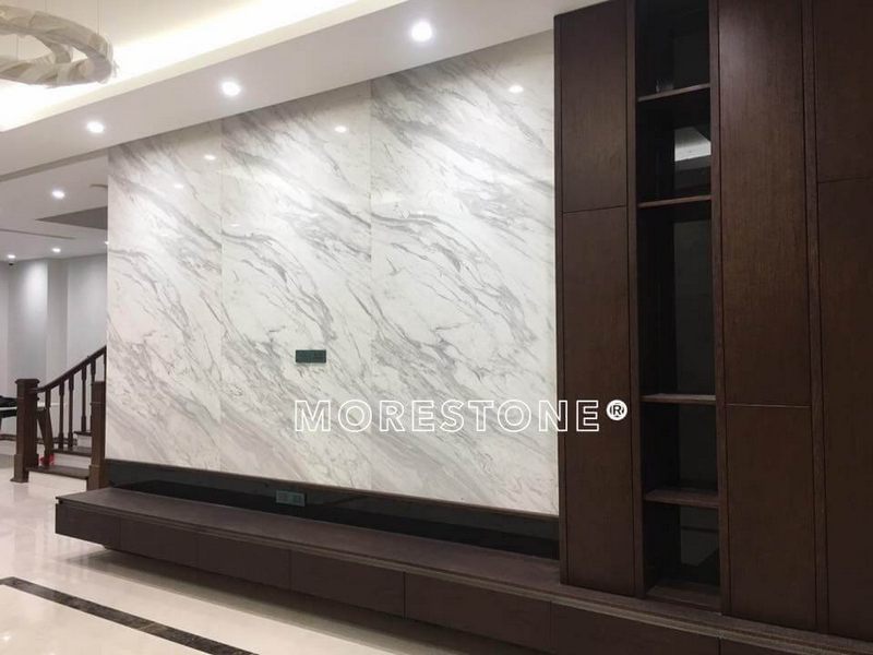Đá ốp vách tivi phòng khách màu trắng vân mây hiện đại tô điểm trang trí tạo điểm nhấn cho không gian cũng như gu thẩm mỹ riêng cho gia chủ.