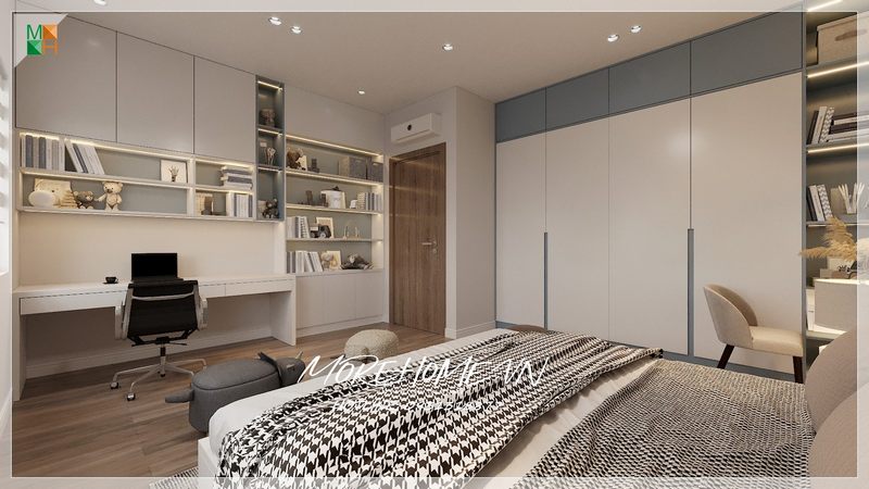Góc học tập bố trí liền kề phòng ngủ kết hợp với kệ sách gỗ công nghiệp đa năng và tiện nghi giúp không gian học tập của con
