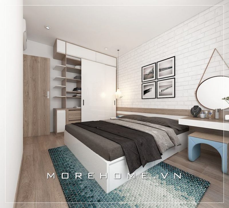 Mẫu giường ngủ gỗ công nghiệp màu trắng tinh tế tạo điểm nhấn hài hòa và thanh thoát hơn cho căn phòng ngủ chung cư nhỏ
