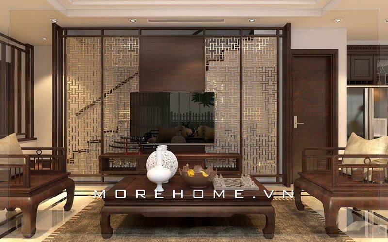 Ốp vách tivi bằng khung gỗ óc chó cao cấp kết hợp tấm sắt mạ ấn tượng cho không gian tiếp khách