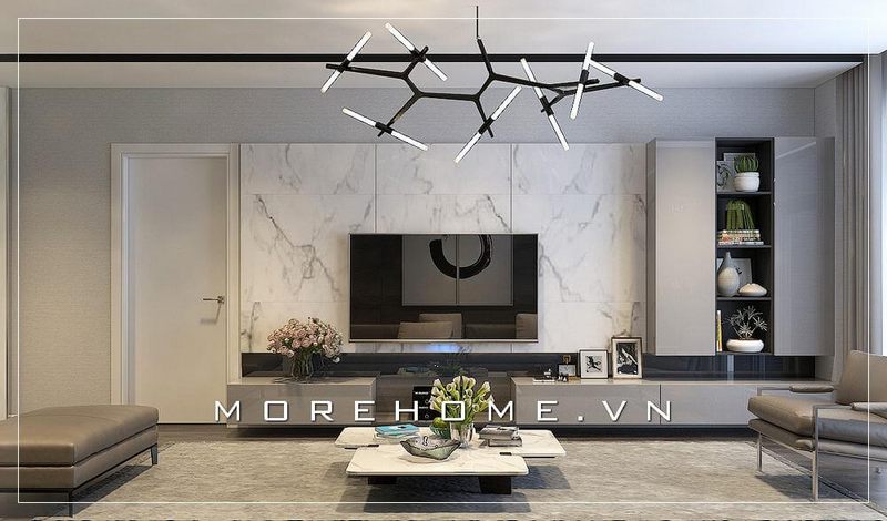 Thiết kế vách tivi bằng đá tự nhiên ốp tường màu trắng hiện đại và sang trọng