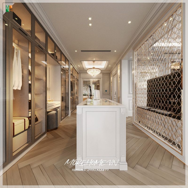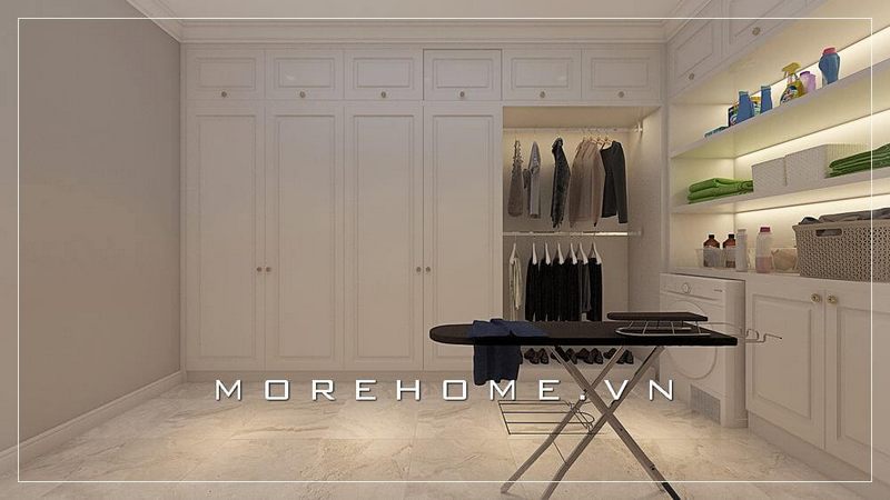 Phòng thay đồ của gia chủ trở lên thời thượng với mẫu tủ quần áo cao cấp màu trắng giúp không gian thoáng hơn, tạo cảm giác rộng rãi hơn