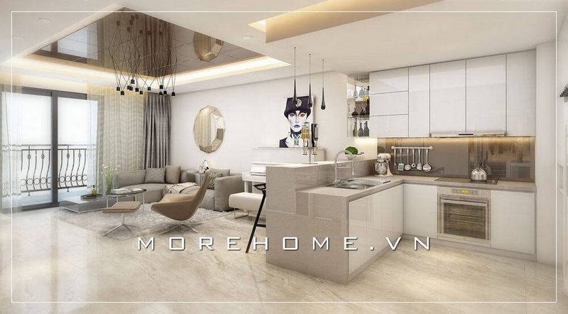 Xu hướng thiết kế nội thất chung cư hiện đại hiện nay được ấn tượng bởi sự kết hợp giữa phòng khách và bếp ăn.