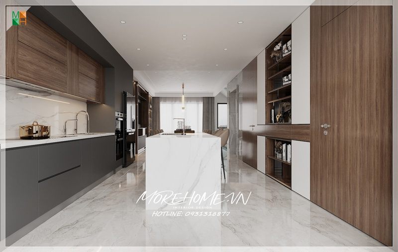 Bức tường được thiết kế để tránh sự thô cứng bằng cách sử dụng giương trang trí chữ nhật ốp 2 bên và ốp nệm đầu giường màu nâu vân gỗ đẹp, độc đáo.