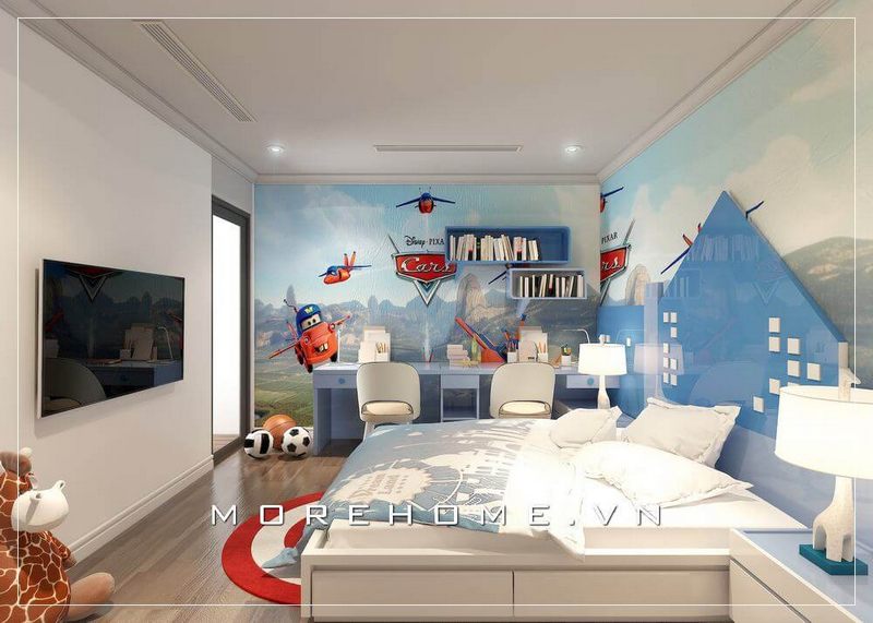 Nội thất phòng ngủ bé trai gỗ công nghiệp tinh tế, kết hợp với chiếc bàn học màu xanh hiện đại và gam màu xanh của giấy dán tường, tạo nên một cảnh đồng bộ trong căn phòng.