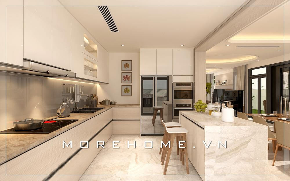 Mẫu thủ bếp gỗ công nghiệp được thiết kế kịch trần, màu trắng tinh tế cũng là gam màu được lựa chọn chủ đạo tạo sự thoáng đãng cho không gian căn bếp