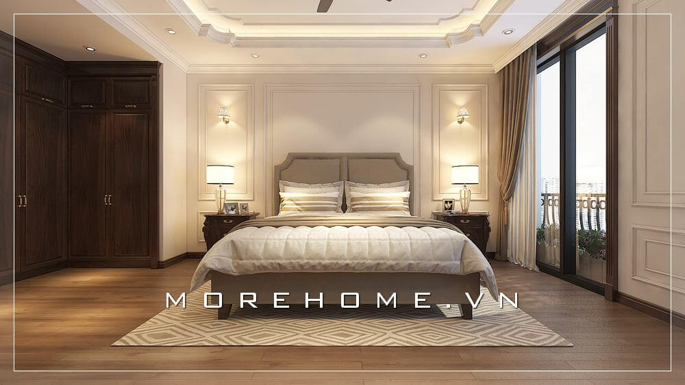 Bố trí nội thất phòng ngủ Master sang trọng với chiếc giường ngủ bọc da phong cách tân cổ điển