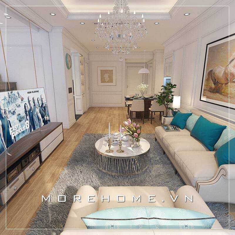Không gian phòng khách chung cư được sử dụng tone màu trắng tinh tế tạo cảm giác tươi mới và hiện đại cho không gian căn hộ